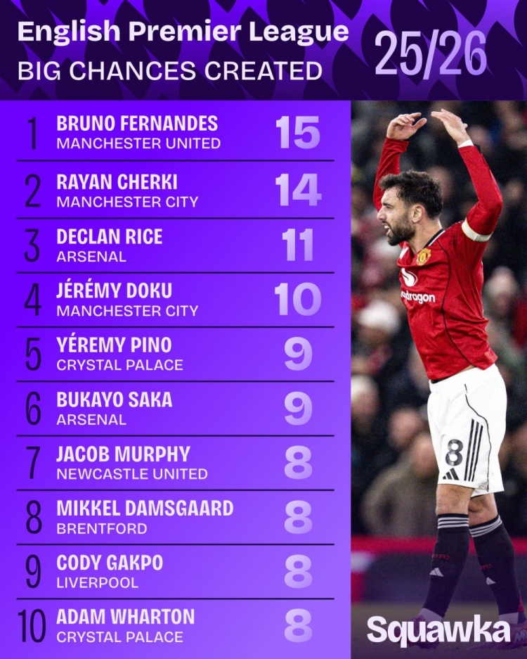 斗球体育直播-本赛季英超创造重大机会榜:B费15次居首,谢尔基、赖斯二三位